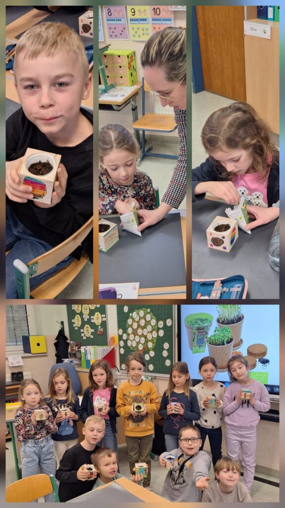 Die Bienenkinder gestalten liebevoll ihre Pflanzbehälter und bauen dann mit unserer lieben Stützkraft Bernadette Kresse an. Jetzt heißt es pflegen und Geduld haben.