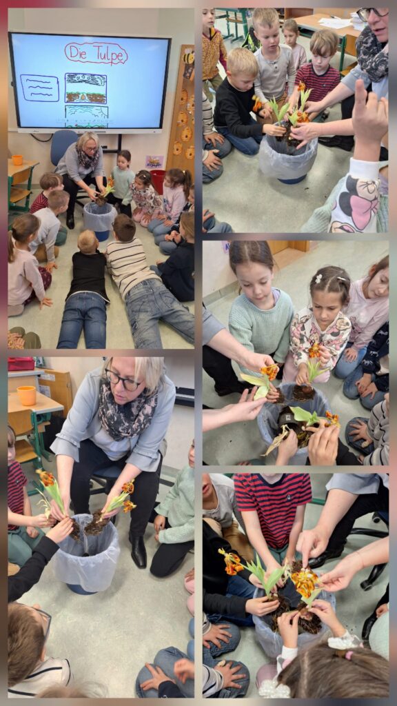 Ebenso ist der Frühling schon in unserer Klasse angekommen. Wir pflegen unsere Frühlingsblumen, benennen sie und lernen den Aufbau der Frühblüher. Nachdem die Kinder das Gedicht: Die Tulpe von Josef Guggenmos hörten und nachspielten, wurde die Tulpe in ihre Bestandteile zerlegt und erforscht.