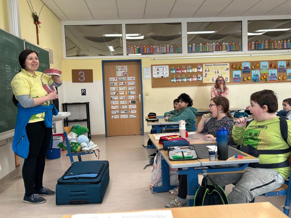Heute hatten die Kinder der Vorschulklasse Besuch von Kroko. Er erklärte uns, worauf wir beim Zähneputzen aufpassen müssen und warum es so wichtig ist, sich täglich die Zähne zu putzen. Es war sehr spannend.