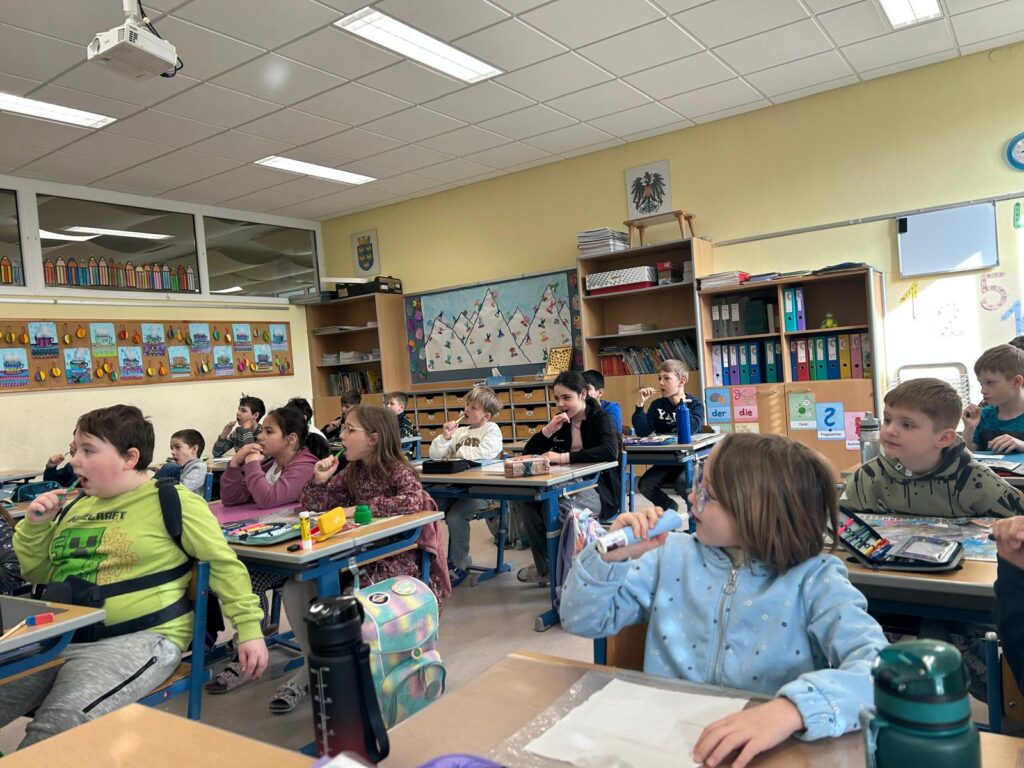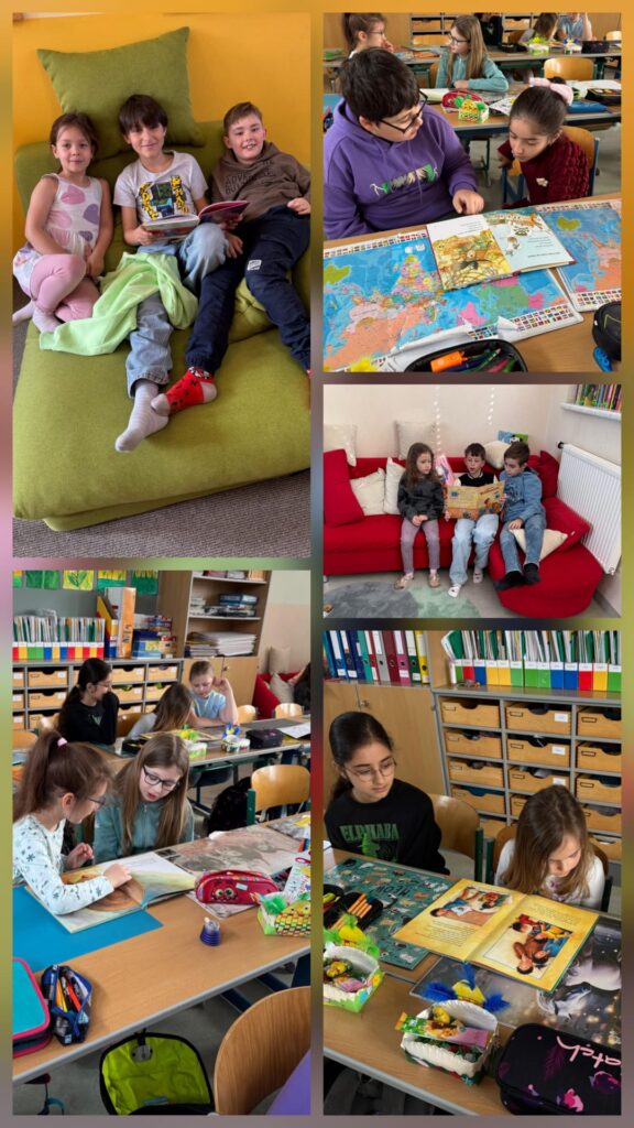 In der 4b Klasse waren Kadriye, Mariam und unsere Lesepatin Brigitte zu Gast und lasen in ihrer Muttersprache (arabisch und türkisch) ihr Lieblingsbuch vor. Lesepatin Brigitte las die Übersetzung. Ein paar „mutige Frösche“ trauten sich auch auf die „Bühne“.