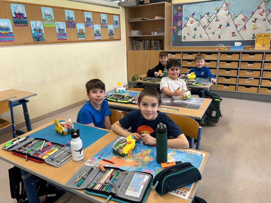 Die Vorschulklasse sowie die 1. und 2. Klassen wurden vor Weihnachten von den Clowns Paula und Fu besucht und „flogen“ gemeinsam mit der Glücksairline in verschiedene Länder, um die Vielfalt der Kulturen kennenzulernen.