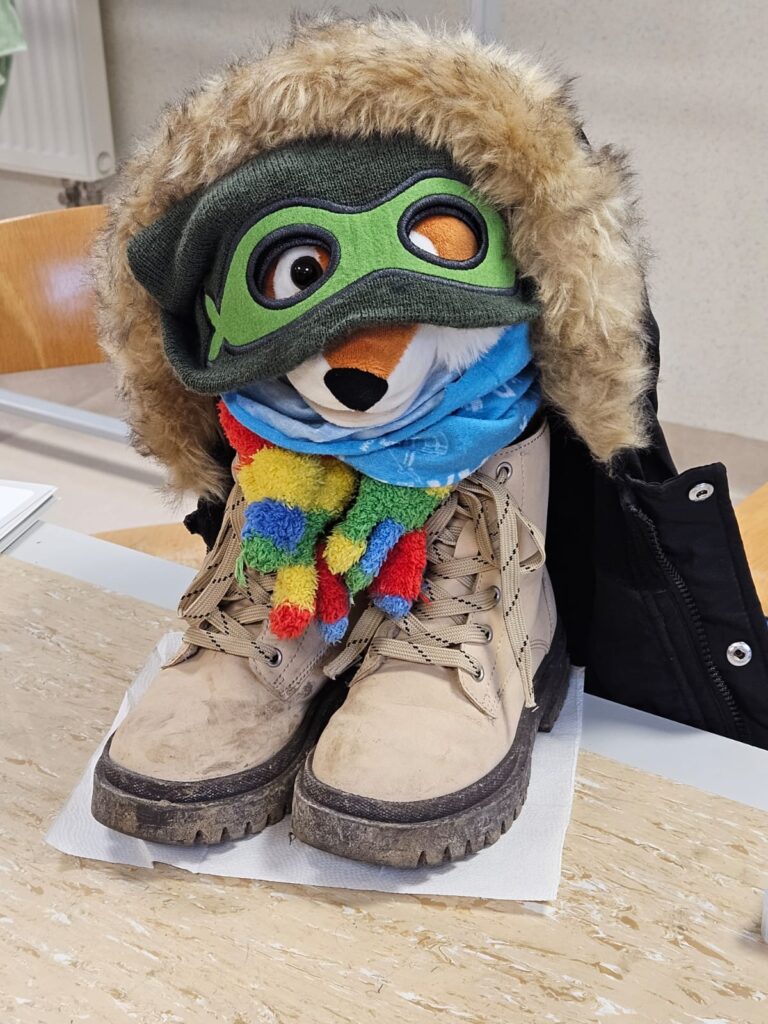 Das Maskottchen der Deutschförderklasse „Fido“ ist bereit für den Winter.