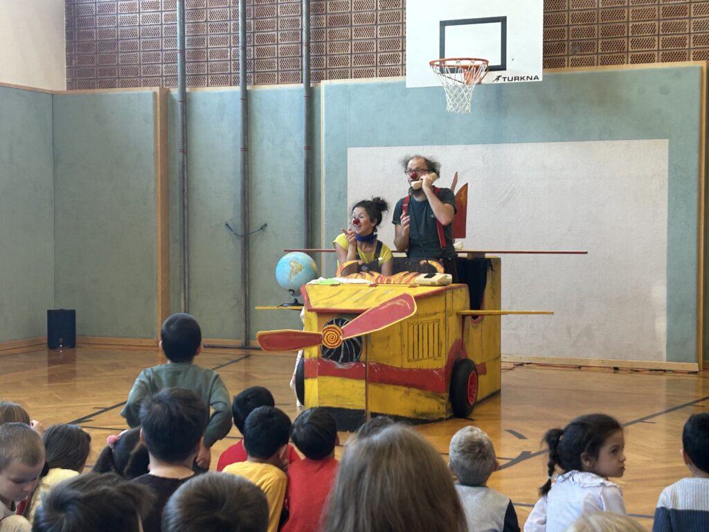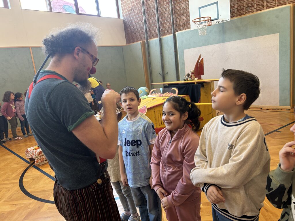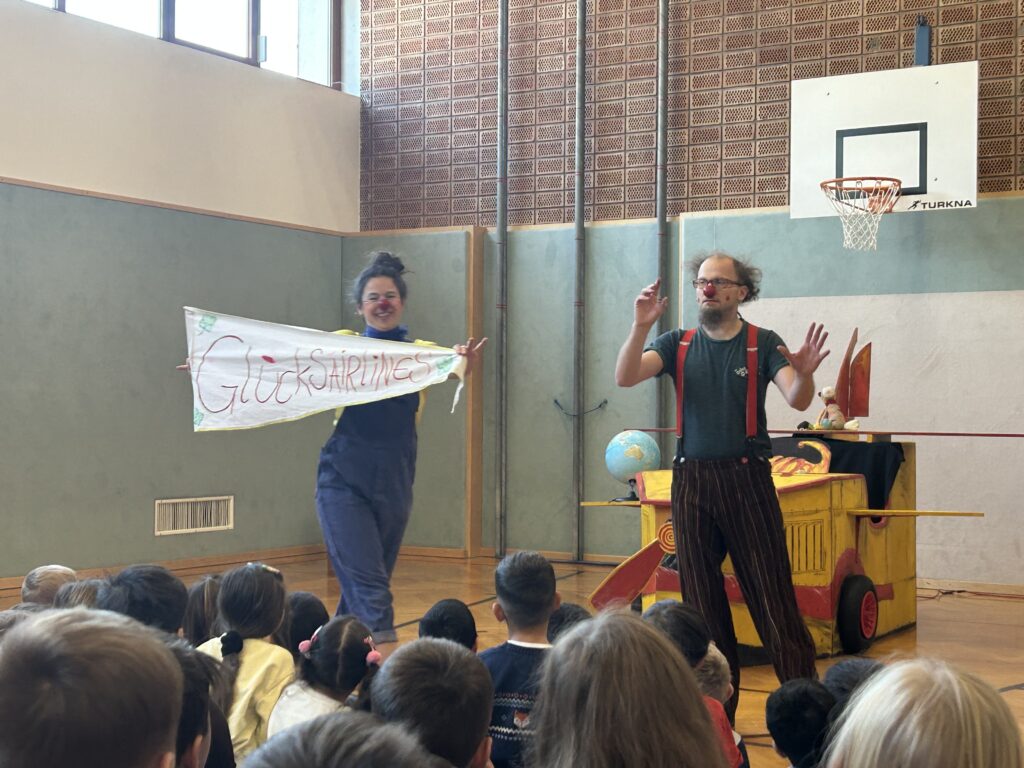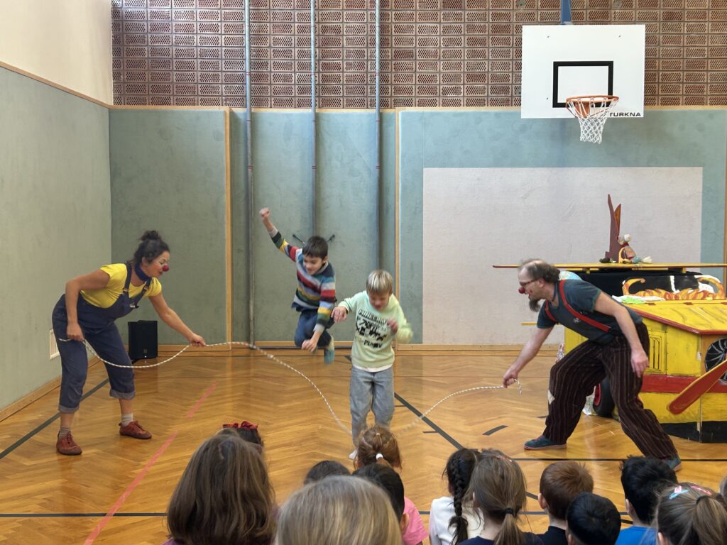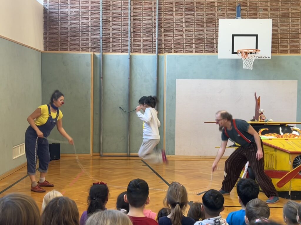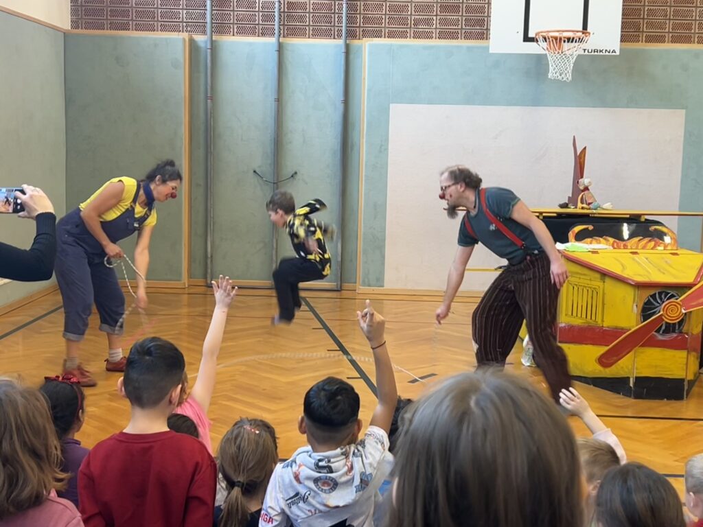 Die Vorschulklasse sowie die 1. und 2. Klassen wurden vor Weihnachten von den Clowns Paula und Fu besucht und „flogen“ gemeinsam mit der Glücksairline in verschiedene Länder, um die Vielfalt der Kulturen kennenzulernen.