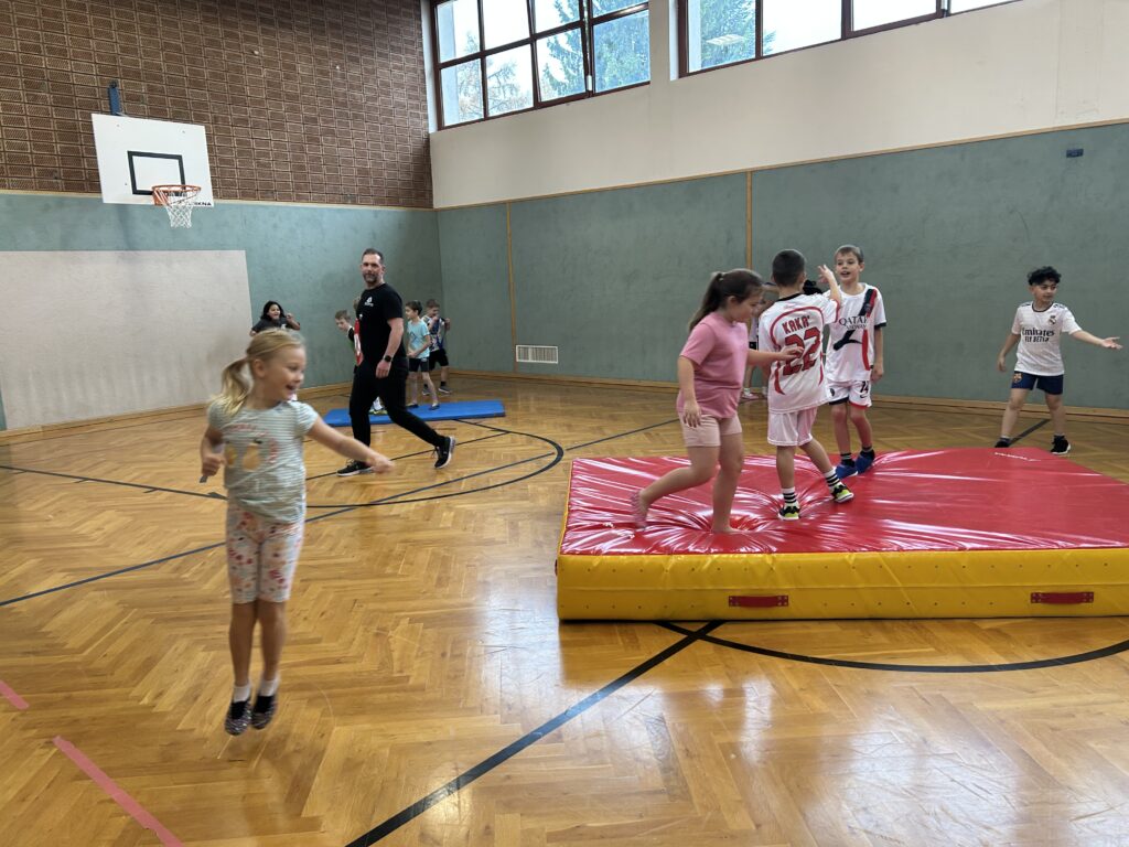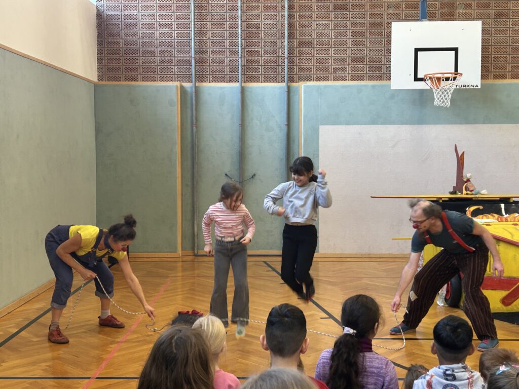 Die Schülerinnen und Schüler der 4a stellten sich einer besonderen Herausforderung: einem mitreißenden Hüpftanz zu modernem Rap. Das Thema „Jump the Rhythm“ war Programm, denn hier ging es nicht nur um Bewegung, sondern auch um Taktgefühl, Koordination und vor allem Teamarbeit.