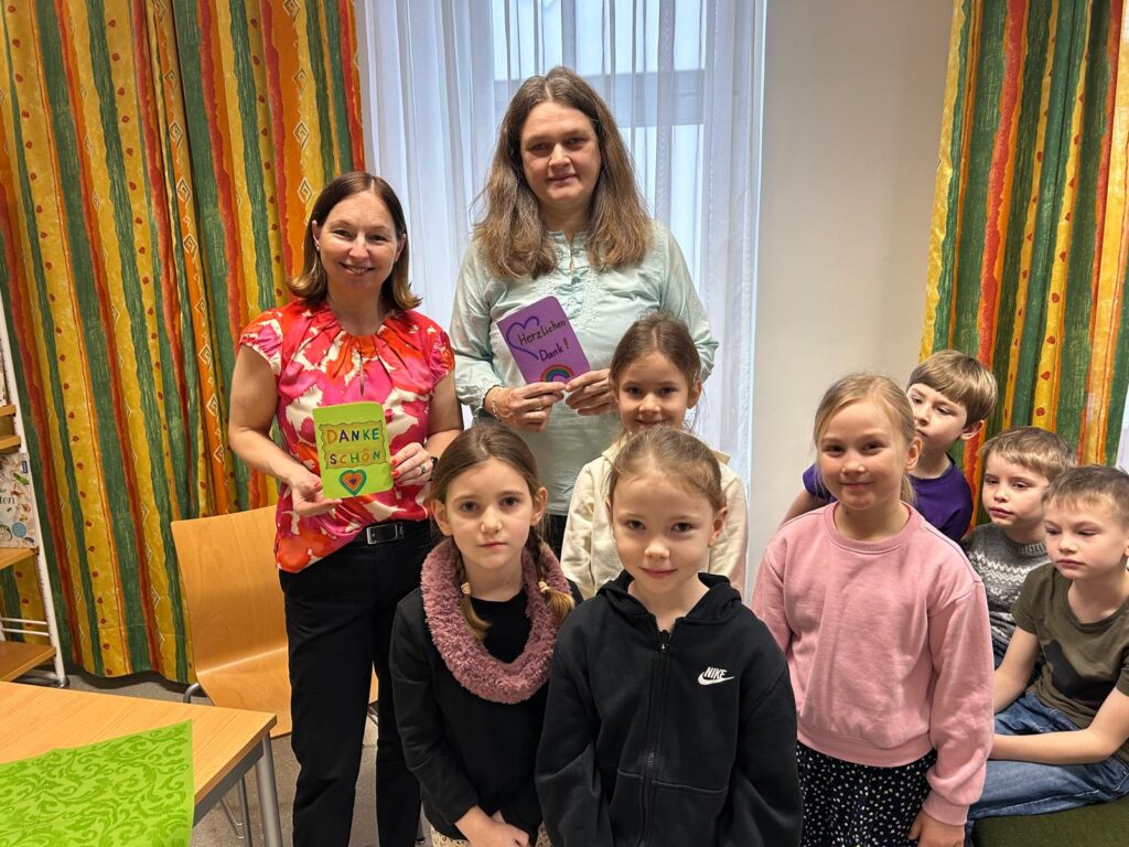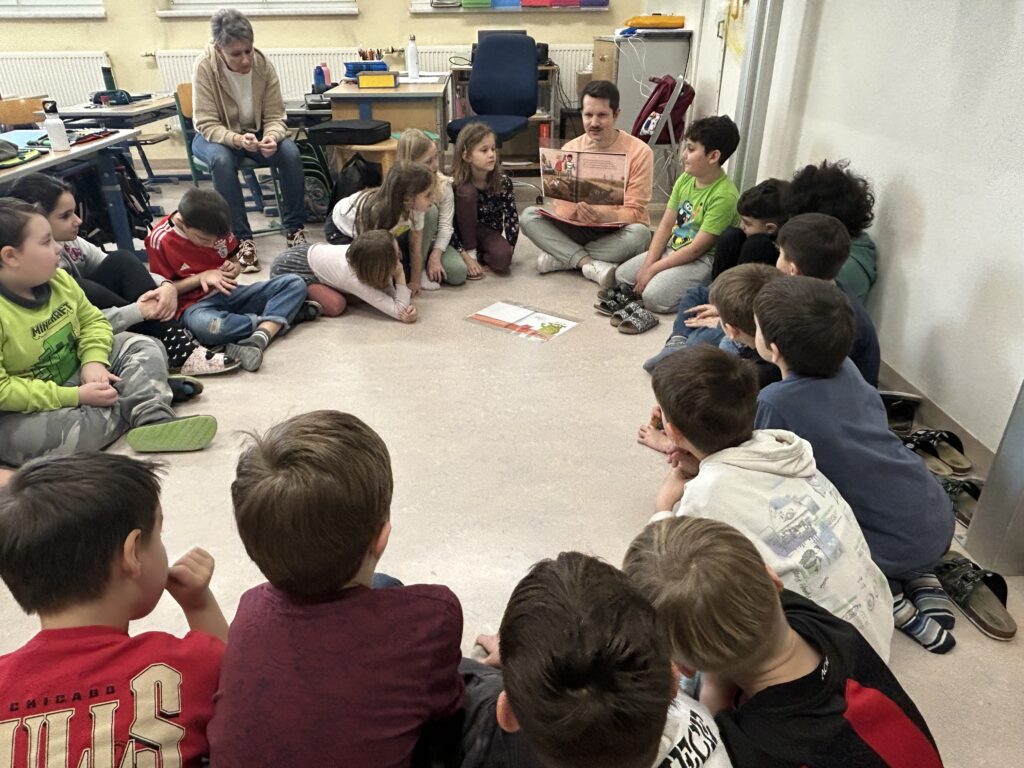 In der 4b Klasse waren Kadriye, Mariam und unsere Lesepatin Brigitte zu Gast und lasen in ihrer Muttersprache (arabisch und türkisch) ihr Lieblingsbuch vor. Lesepatin Brigitte las die Übersetzung. Ein paar „mutige Frösche“ trauten sich auch auf die „Bühne“.